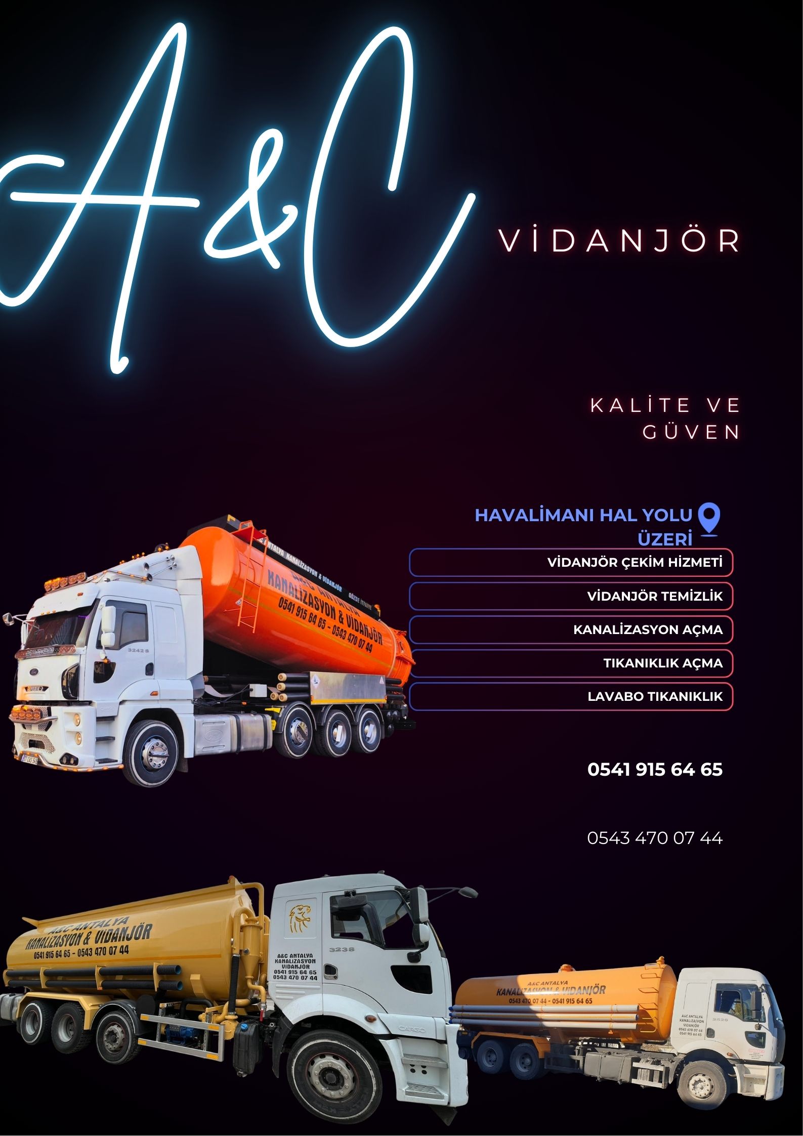ANTALYA DA VİDANJÖR HİZMETİ SUNAN VE KALİTENİN VE GÜVENİN TEK ADRESİ OLAN A&C ANTALYA KANALİZASYON VE VİDANJÖR 7 GÜN 24 SAAT HİZMET İMKANI SUNMAKTADIR